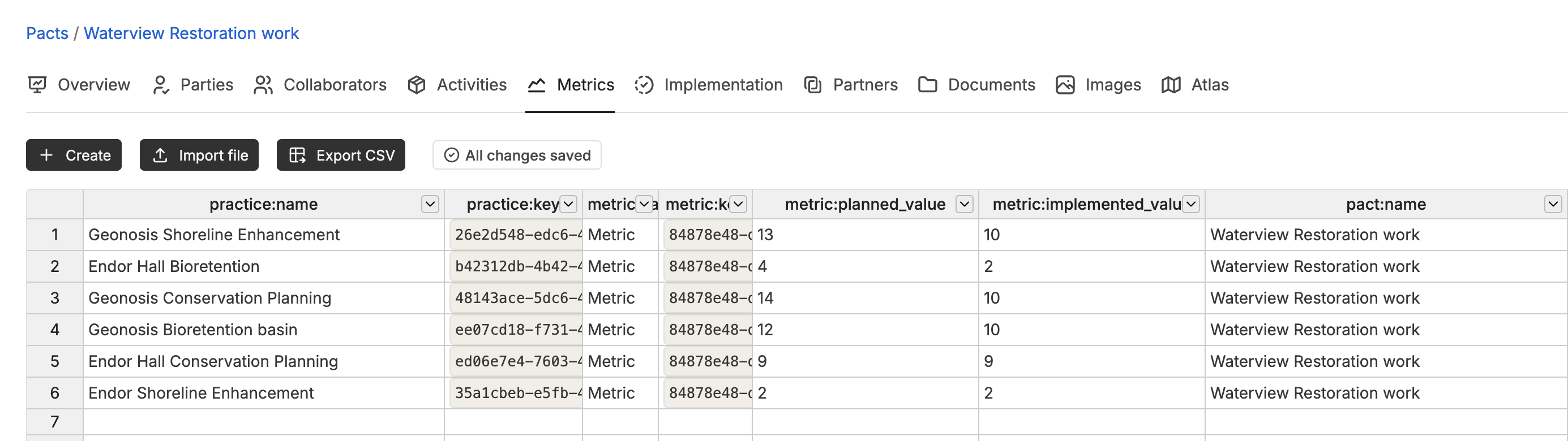 We streamlined batch editing for metric values by consolidating all data into one table, found on the **Metrics** tab. You can view metric targets in the `planned_value` column alongside reported values in the `implemented_value` column. This change eliminates the need to switch between tables and copy-paste starter rows. The obsolete **Implementation** tab will be removed in a future release.<br>